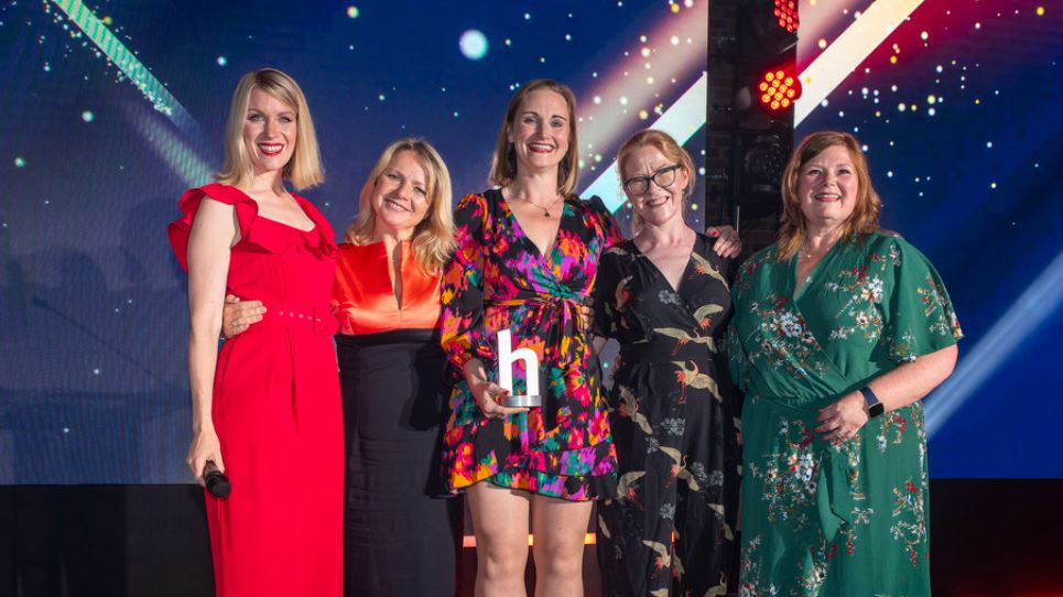 Hargreaves Lansdown collect their trophy from Sally Walton, Head of Financial Services at SEC Newgate, and Awards host Rachel Parris.