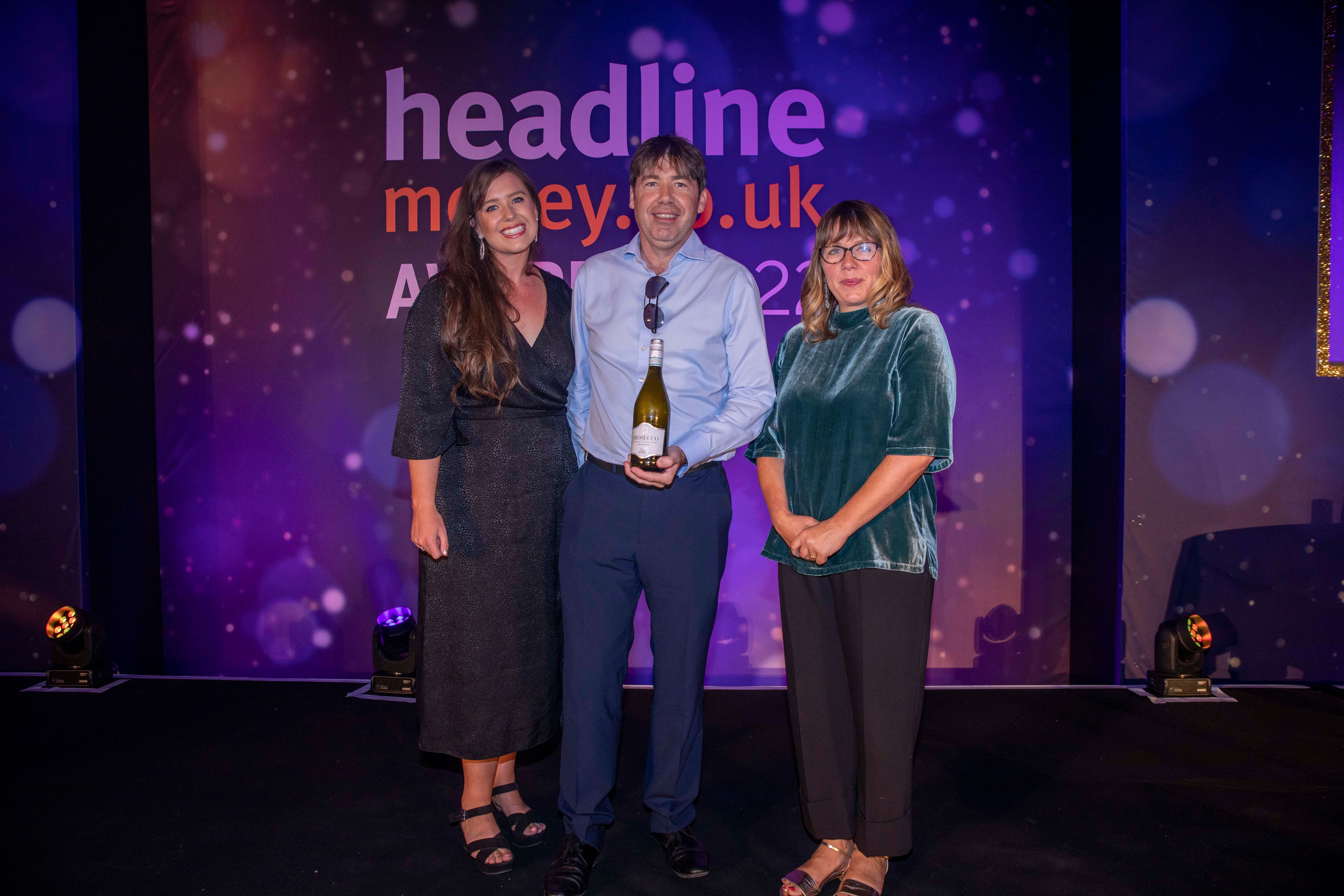 On behalf of Polly Jean Harrison, The Fintech Times, Headlinemoney's Martin Quinn collects the trophy from Georgia Marchant, Senior PR Manager at Mercuryo and awards host Kerry Godliman