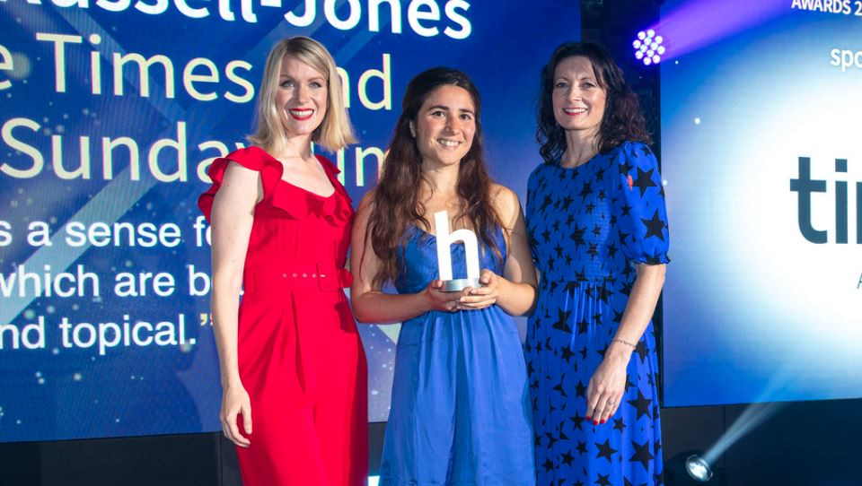 Lily Russell-Jones, The Times and The Sunday Times, collects her trophy from Linda Winder, Brand and Communications Director at Tink, and Awards host Rachel Parris.