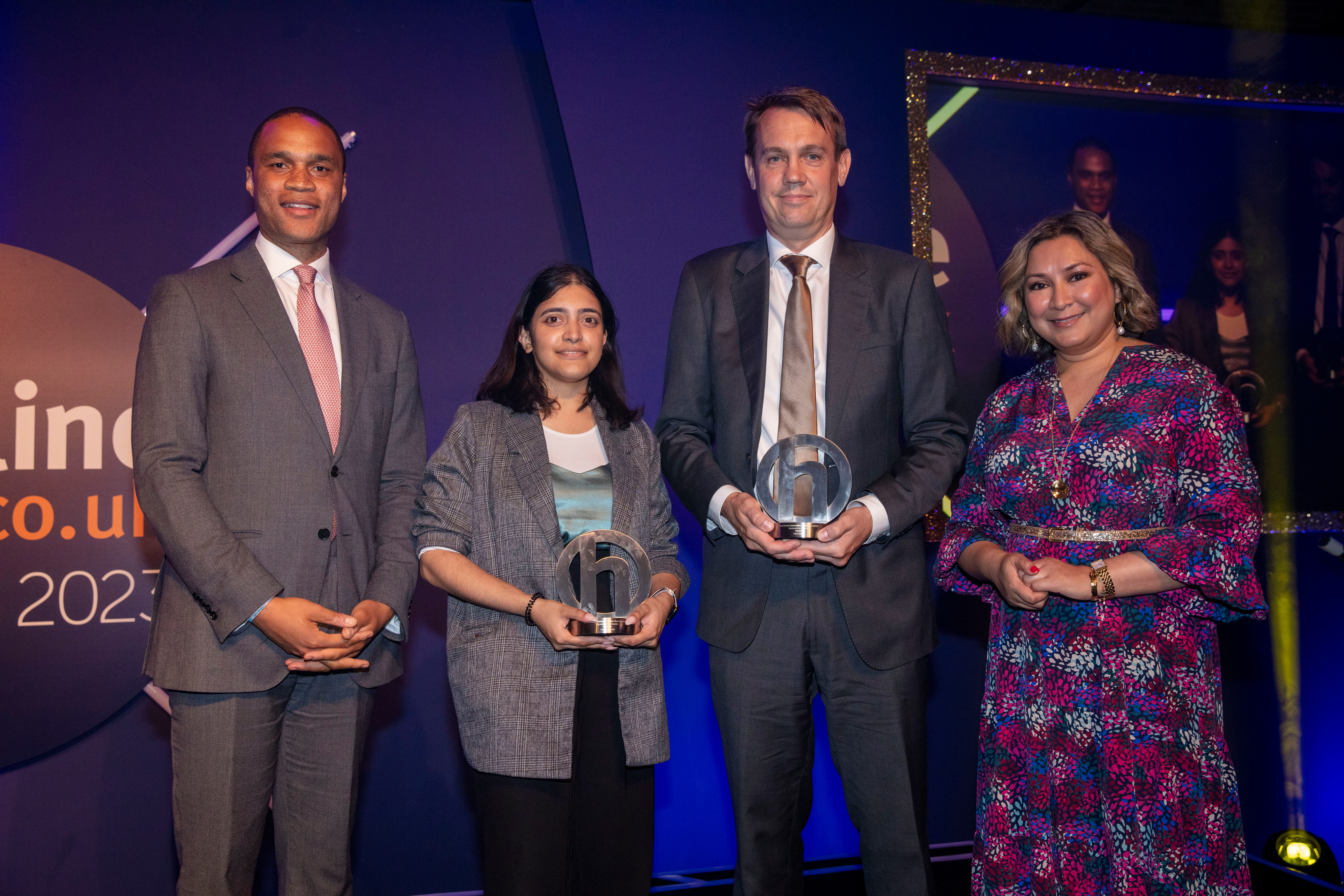 Risk.net's Luke Clancy and the Telegraph's Lauren Almeida collects their trophies from Augustine Chipungu, PR Manager at Schroders and awards host Ayesha Hazarika MBE