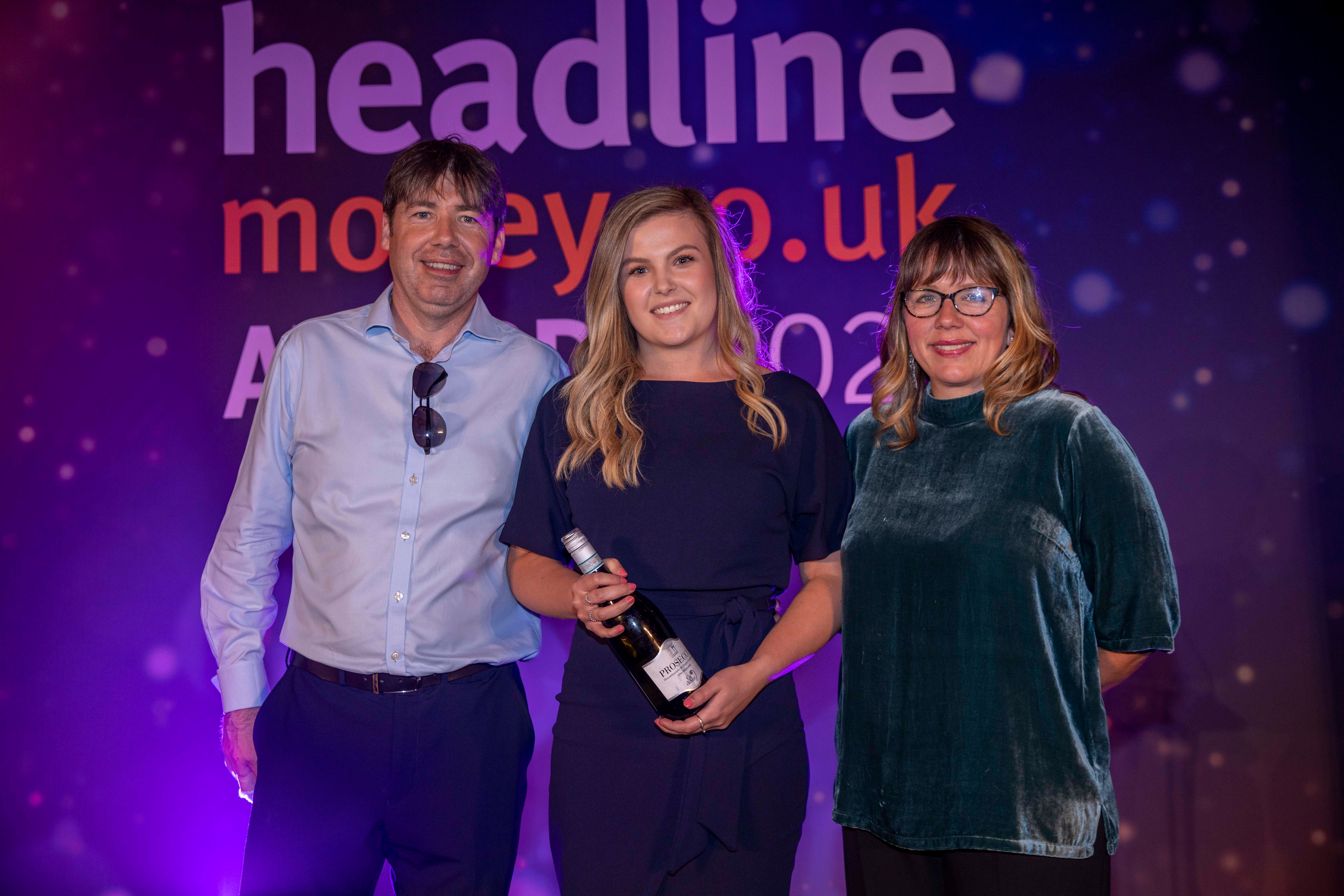 Quilter's Meghan Crookes collects her trophy from Martin Quinn, Head of Sales and Account Management at Headlinemoney and awards host Kerry Godliman