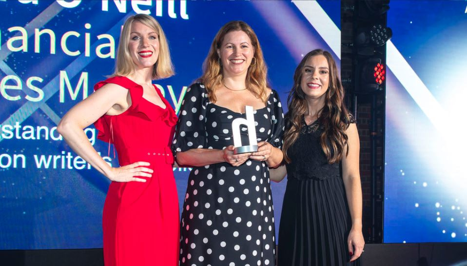 Moira O’Neill, Financial Times Money, collects her trophy from Sarah Squelch, Head of Product Marketing at Vitality, and Awards host Rachel Parris.