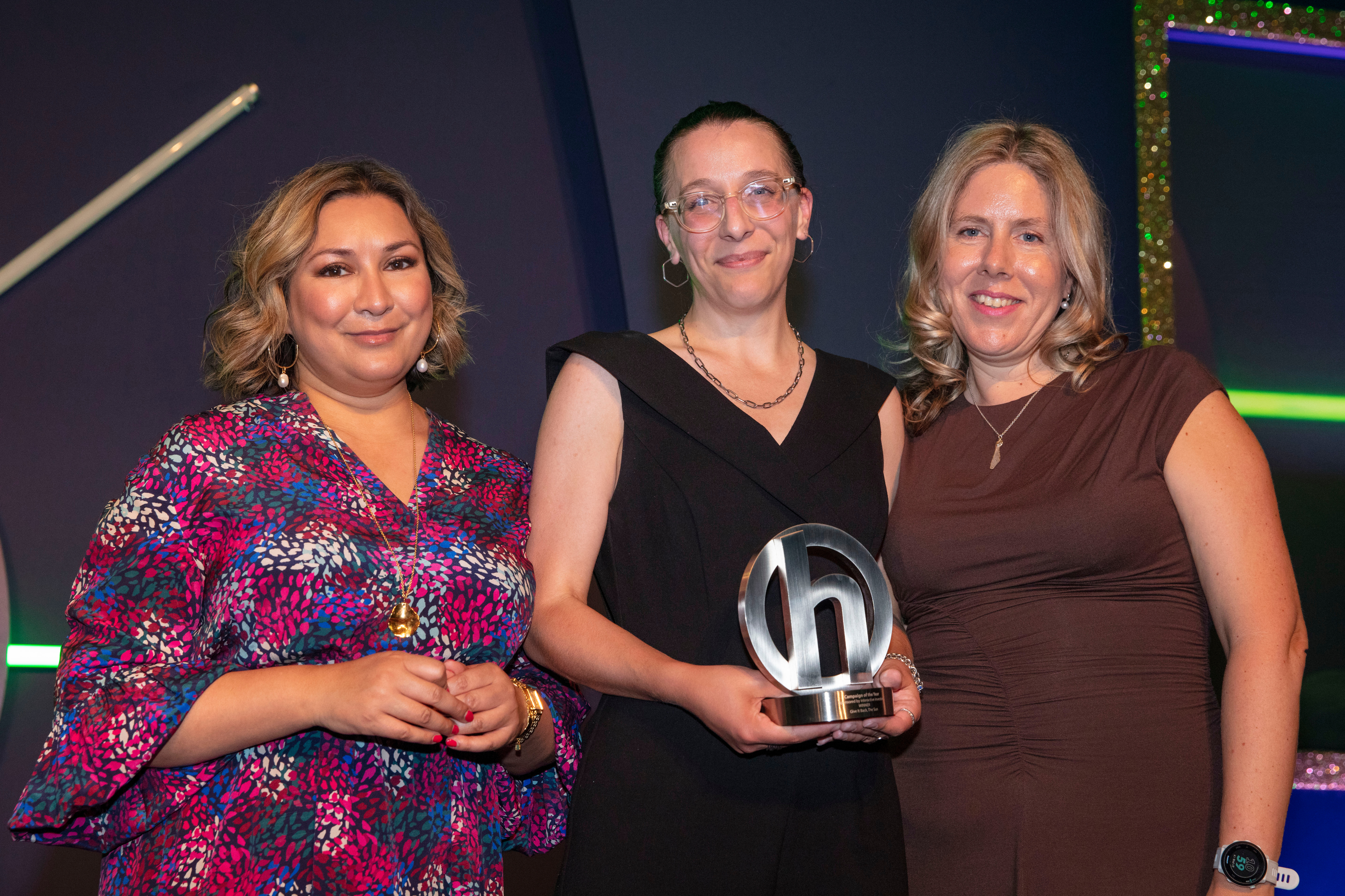 Lynsey Barber on behalf of The Sun, collects the trophy from Jemma Jackson Head of PR at interactive investor and awards host Ayesha Hazarika MBE