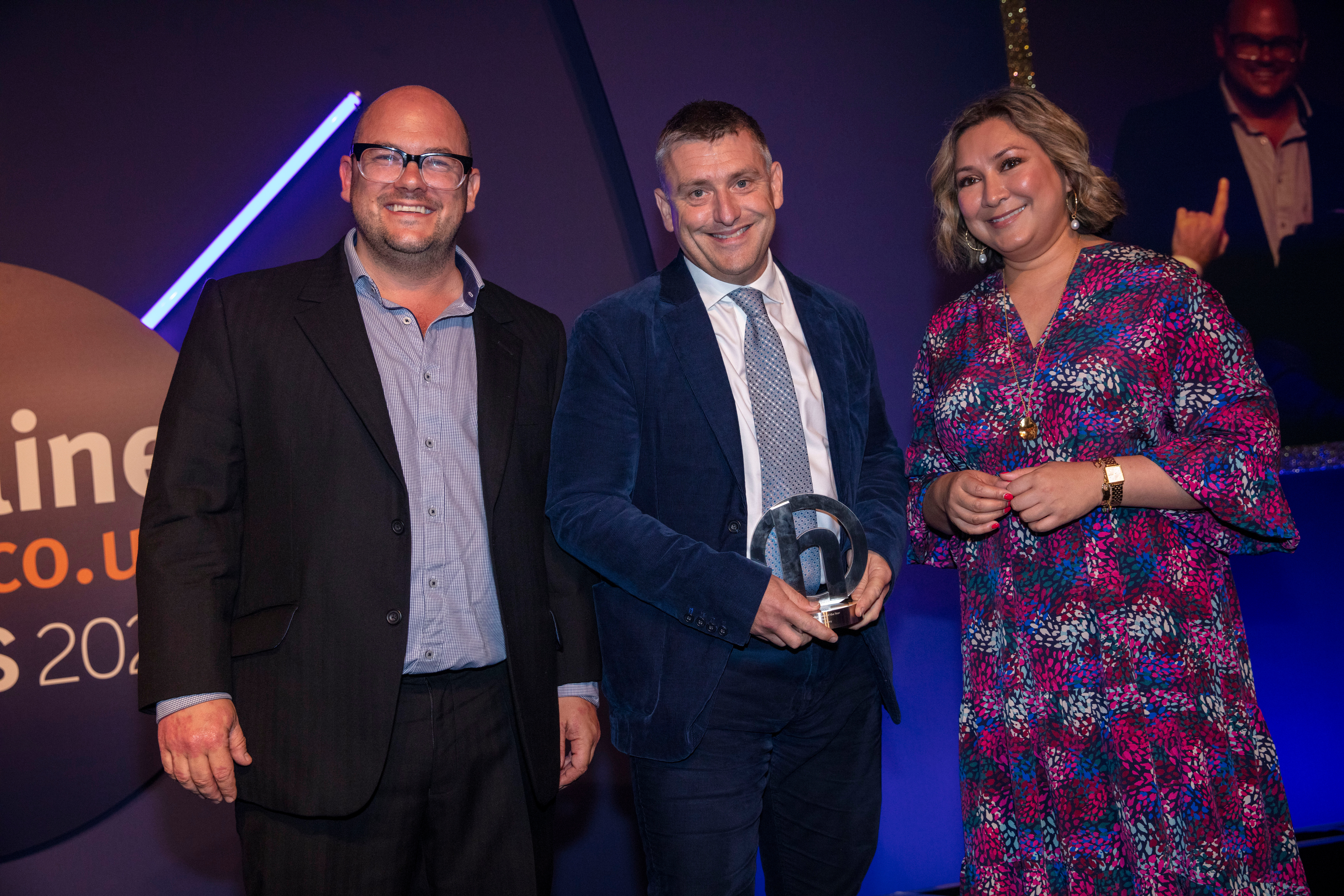 2023 winner Evelyn Partners' Adrian Lowery collects his trophy from Chris Mounsey-Thear, Client Director at markettiers4DC