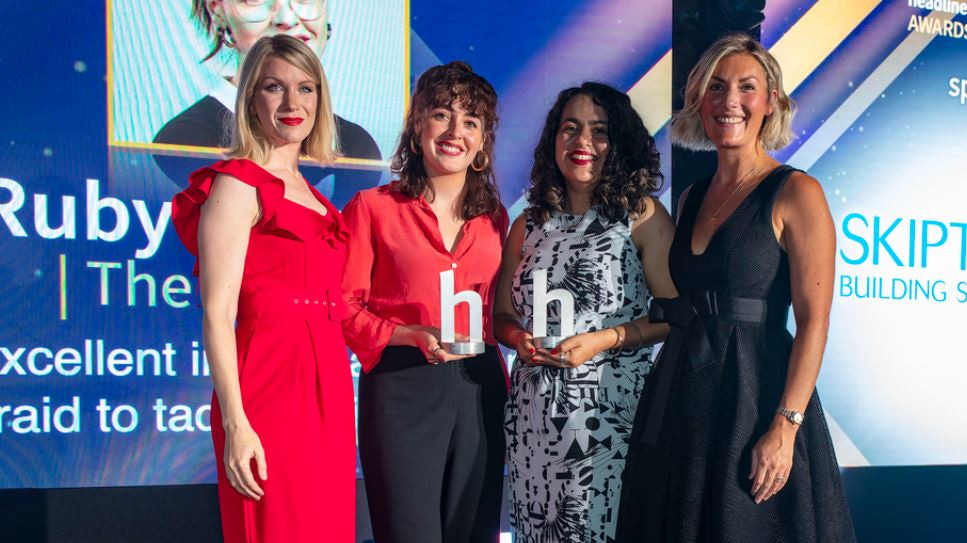 Mortgage Solutions' Anna Sagar and The Telegraph’s Ruby Hinchliffe collect their trophies from Charlotte Harrison, CEO of Home Financing at Skipton Building Society, and Awards host Rachel Parris.