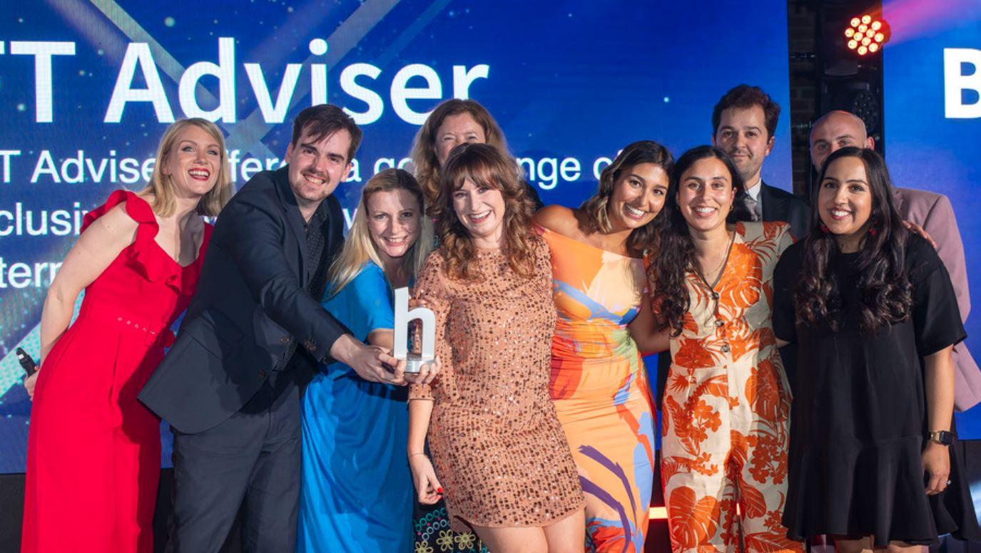 The team at FT Adviser collect their trophy from Sally Hamilton, Daily Mail Consumer Champion, and Awards host Rachel Parris.