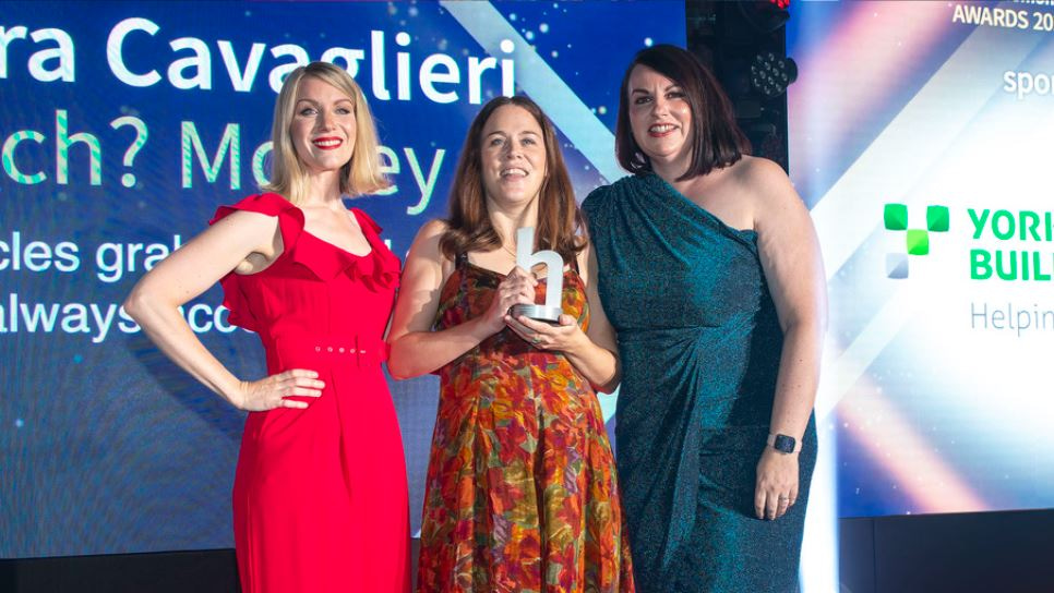 Chiara Cavaglieri, Which? Money, collects her trophy from Laura Fozard, External Communications Manager at Yorkshire Building Society, and Awards host Rachel Parris.